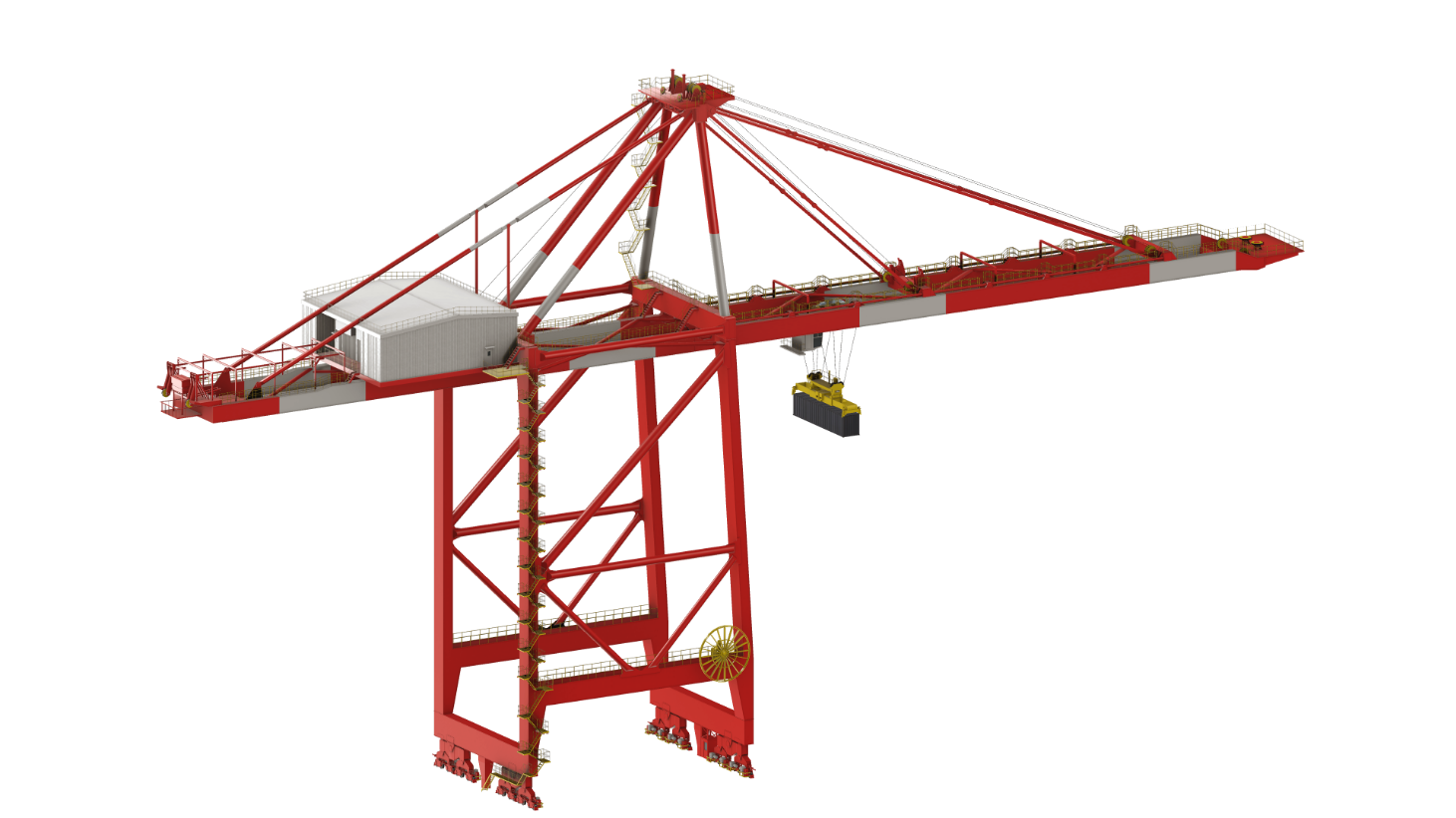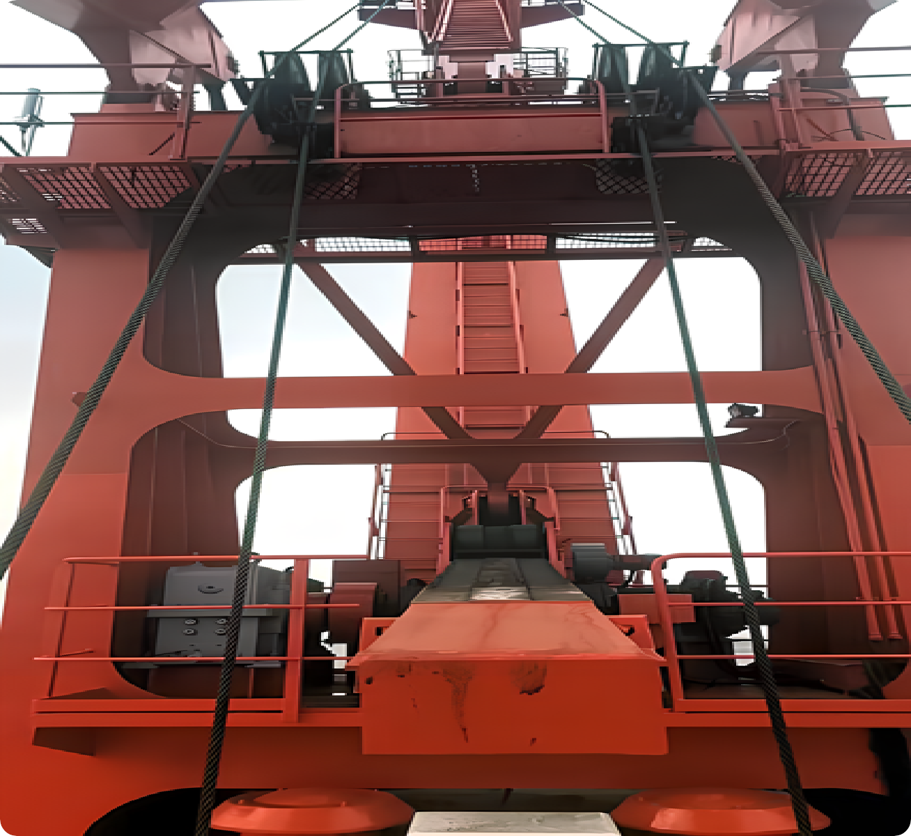 對岸橋的前拉桿、中拉桿、后拉桿、主梁、梯形門架、斜撐桿等受力集中點和重要部位、輪胎吊/軌道吊的主梁、門框立柱、主梁與立柱連接處等受力集中點和重要部位進行應(yīng)力監(jiān)測,實時掌握受力大小,對受力過大進行預(yù)警,對受力不對稱進行拉力比和不對稱度進行分析,避免受力不均過大。